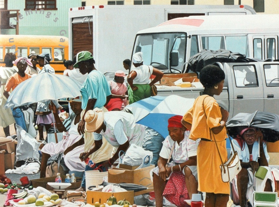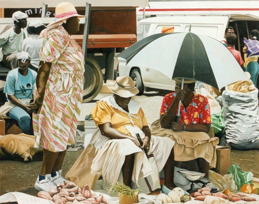 My fascination with the effect of light on surfaces began after a number of visits to the island of Antigua. I became interested in people involved in their public lives in the market and streets of St Johns, in the minutiae of objects surrounding them, the packaging, and what was being sold or discarded. I was struck by the rich colours and patterns of clothing and the effect of strong sunlight on them.