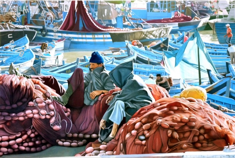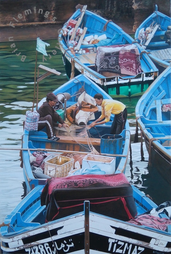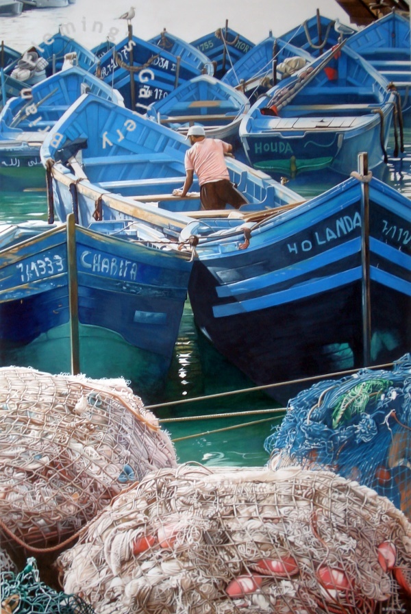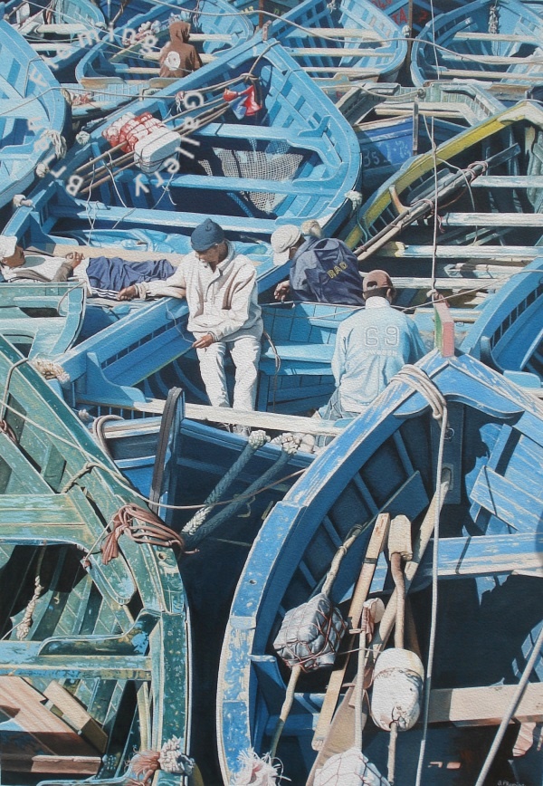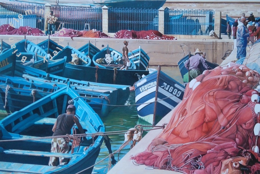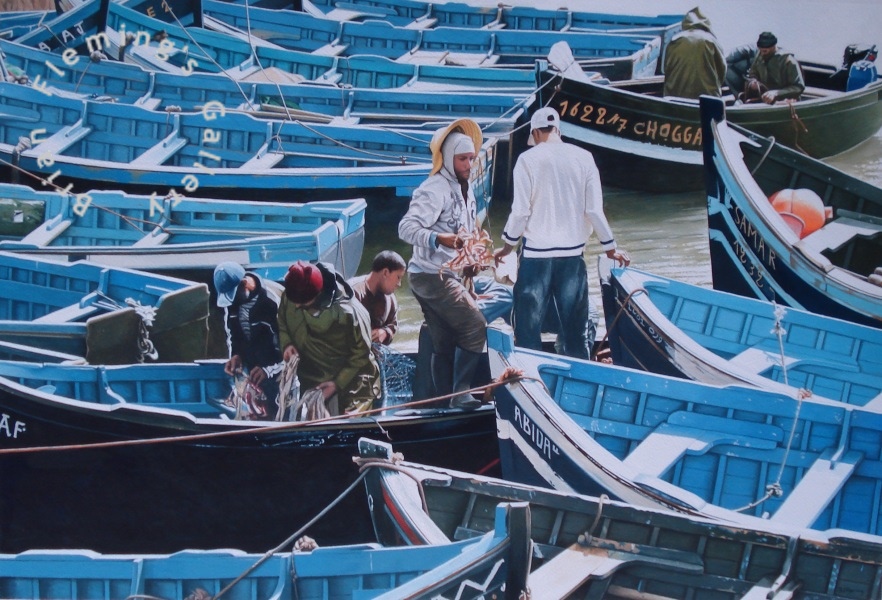 These paintings depict activities in and around the fishing port at Essaouira on the Atlantic coast of Morocco. The play of sunlight on the water is complemented by the blue of the small boats. This particular blue is called Mogador Blue after the old Portuguese name for Essaouira.