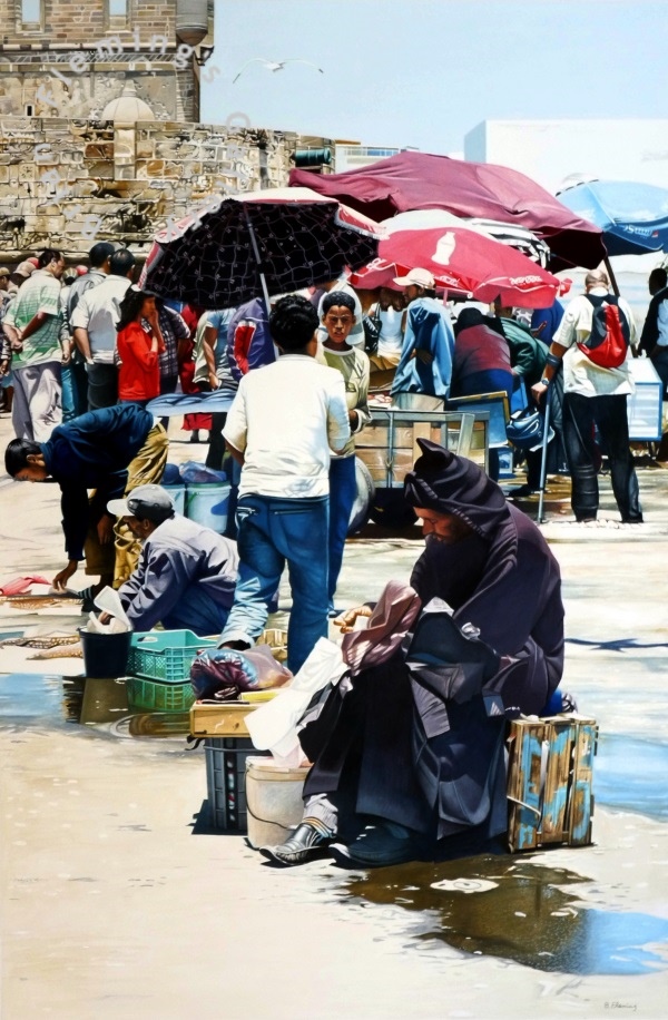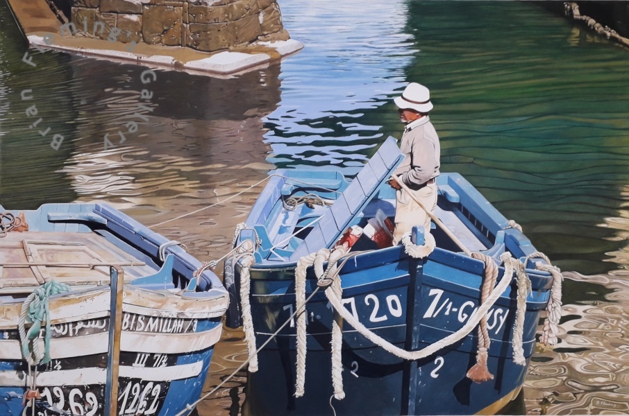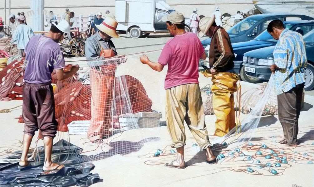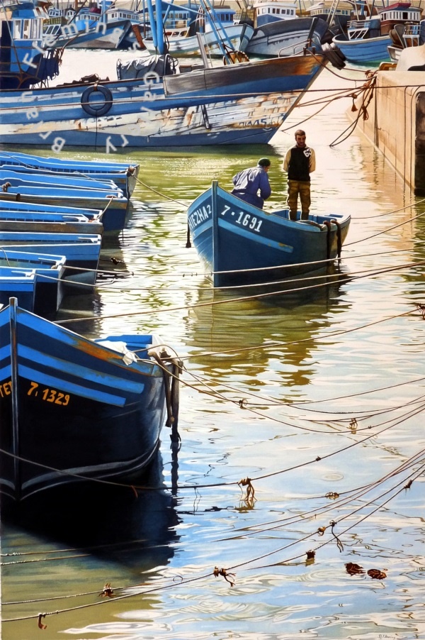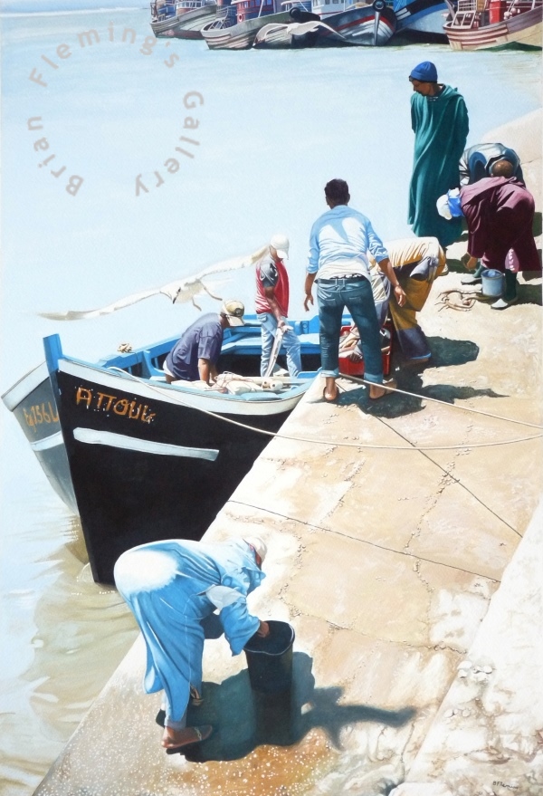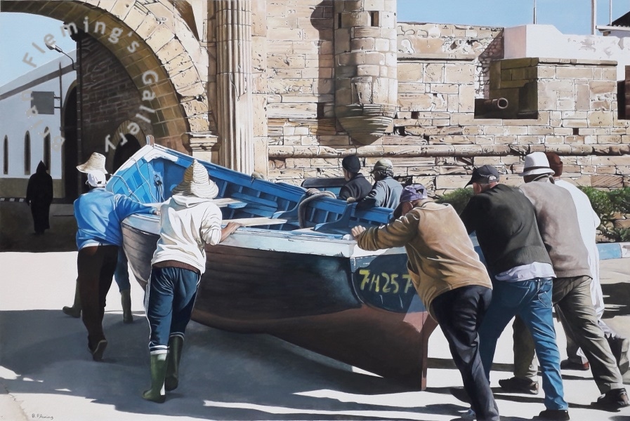 These paintings depict activities in and around the fishing port at Essaouira on the Atlantic coast of Morocco. The play of sunlight on the water is complemented by the blue of the small boats. This particular blue is called Mogador Blue after the old Portuguese name for Essaouira.